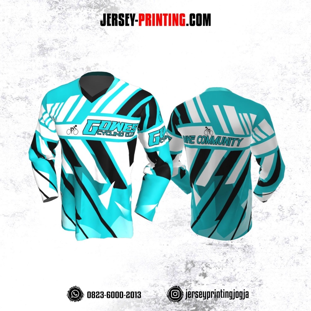 Jersey Gowes Sepeda Biru Aqua Putih Strip Lengan Panjang
