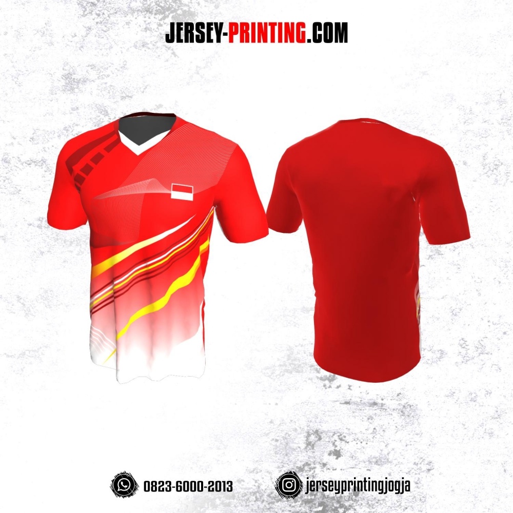 Jersey Badminton Merah Putih Kuning Motif Garis Abstrak