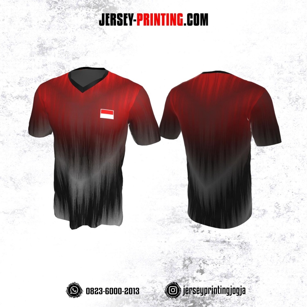 Jersey Badminton Merah Hitam Motif Garis Abu-abu