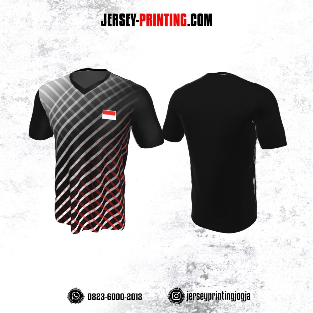 Jersey Badminton Hitam Motif Garis Putih Merah