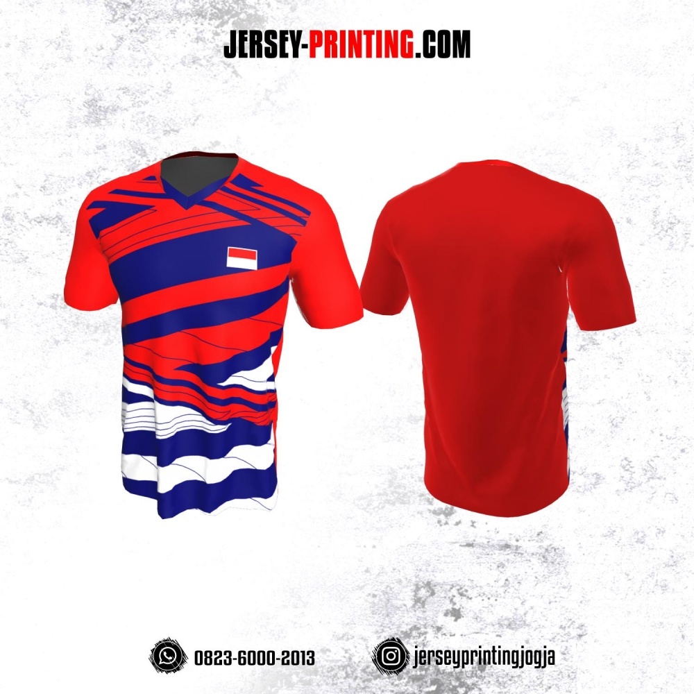 Jersey Badminton Merah Biru Putih Motif Garis Abstrak