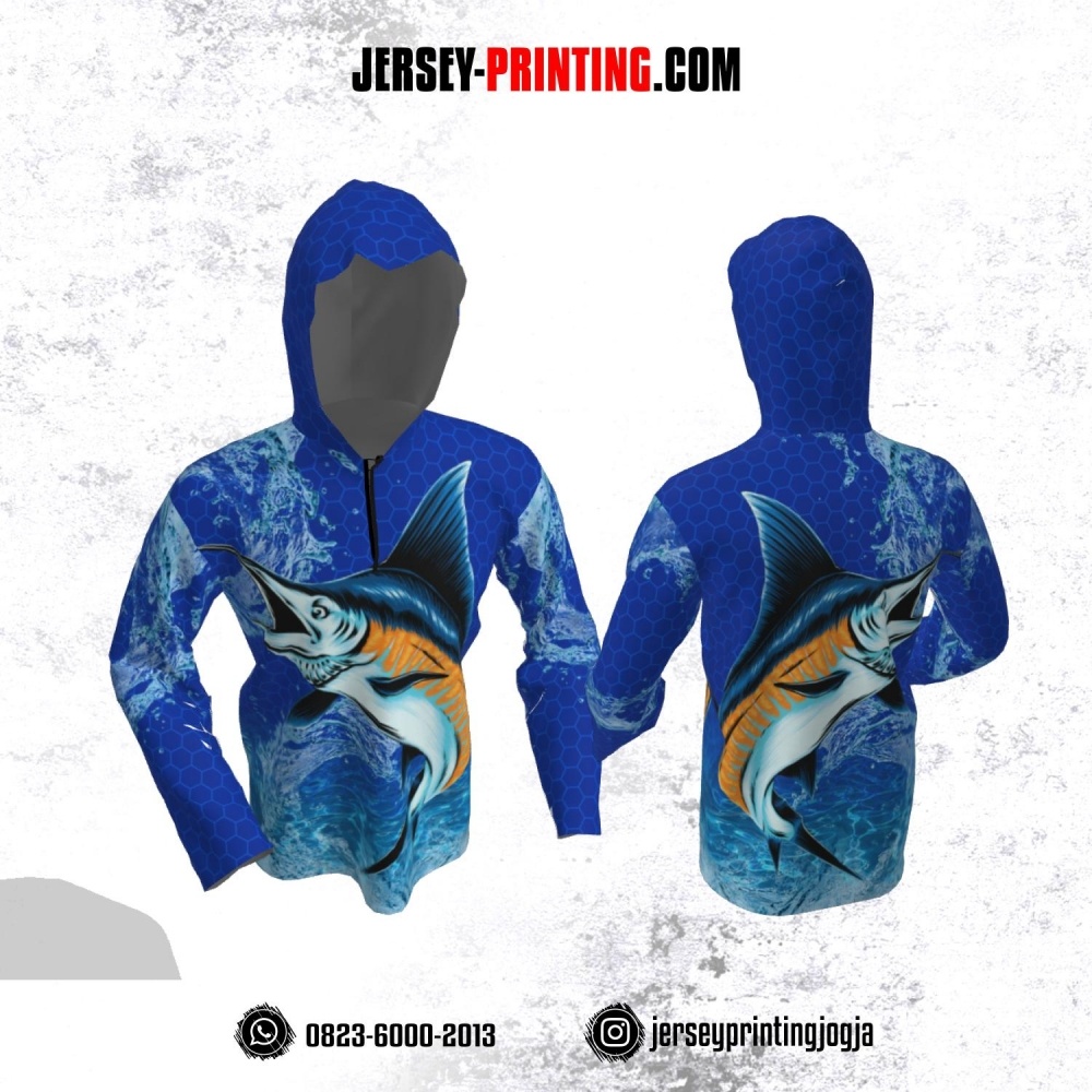 Jersey Hoodie Kupluk Mancing Fishing Angler Biru Navy Motif Honeycomb Lengan Panjang