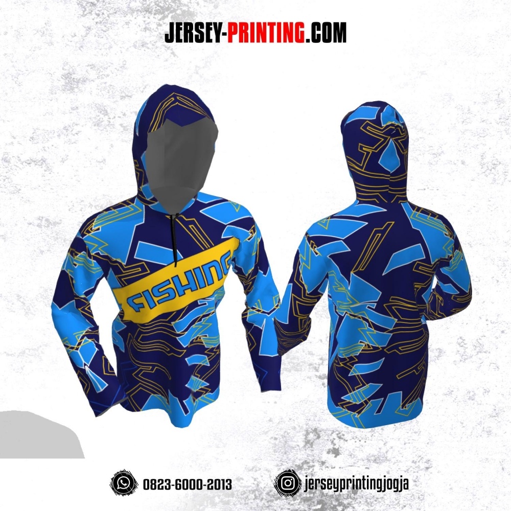 Jersey Hoodie Kupluk Mancing Fishing Angler Navy Motif Abstrak Biru Kuning Lengan Panjang