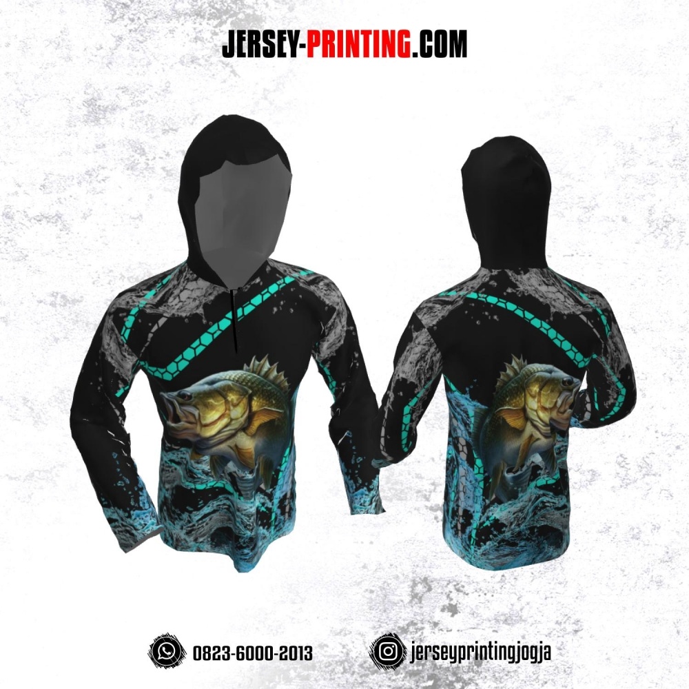 Jersey Hoodie Kupluk Mancing Fishing Angler Hitam Motif Air Biru Abu-abu Lengan Panjang