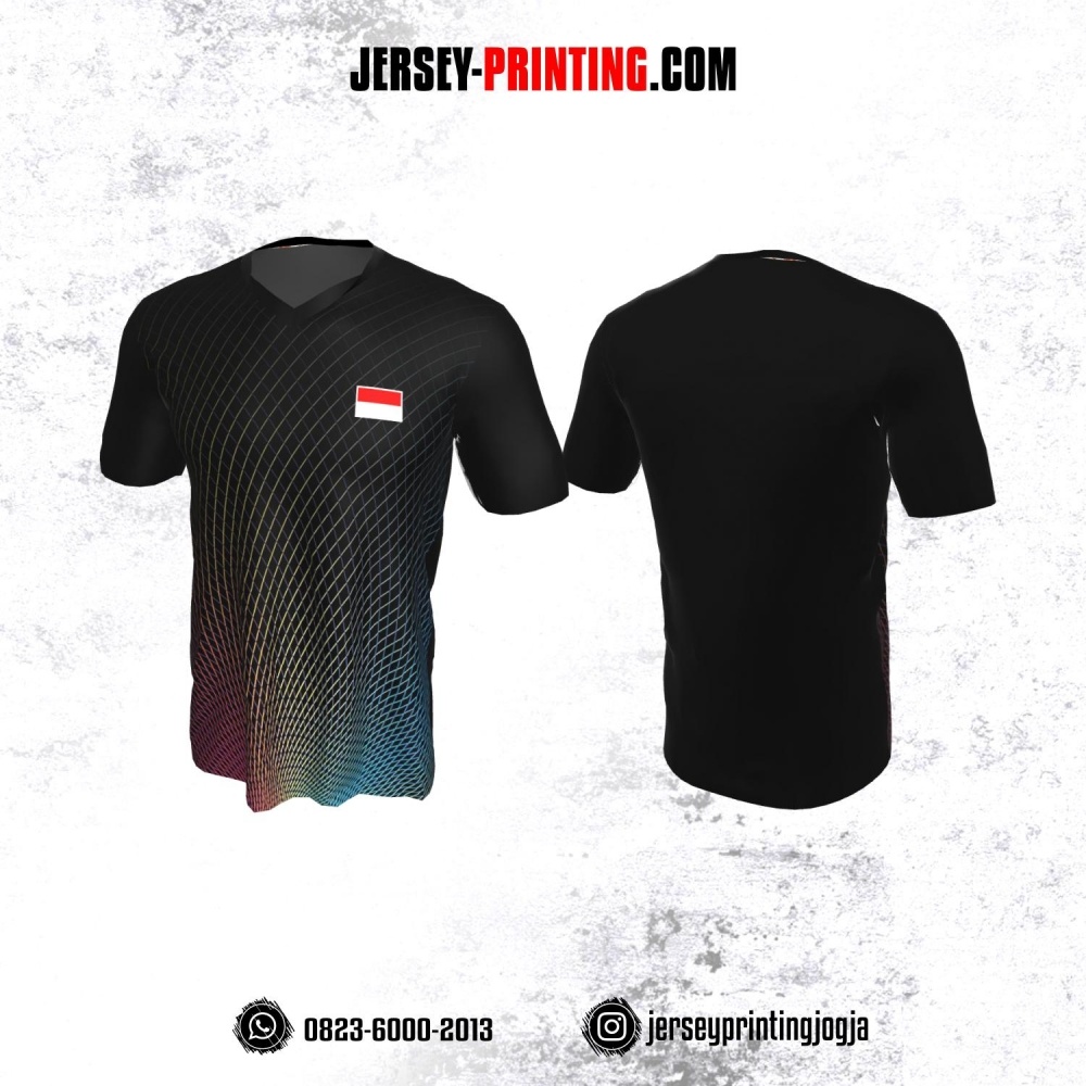 Jersey Badminton Hitam Motif Garis Biru Kuning Pink
