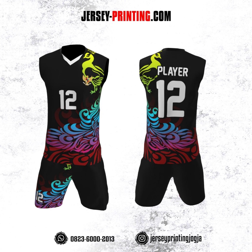 Jersey Baju Volly Tanpa Lengan Hitam Motif Batik Merah Biru Pink