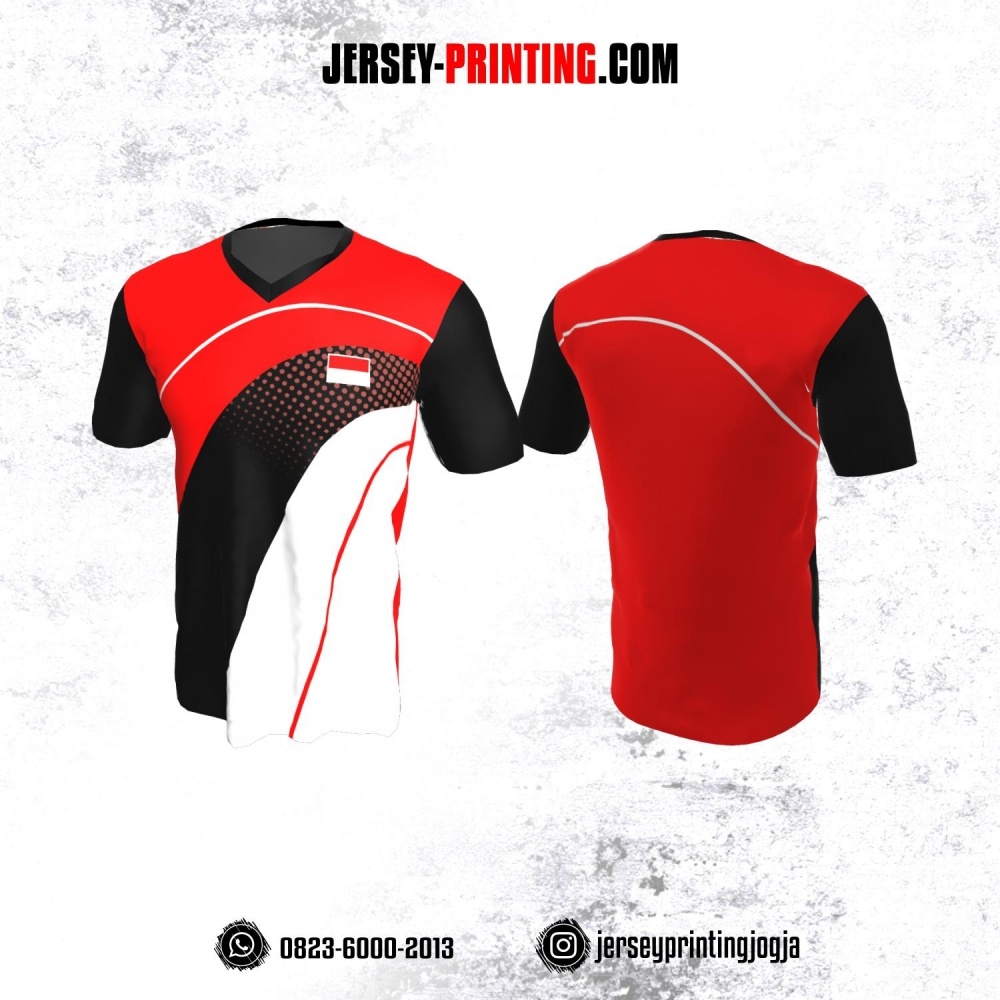 Jersey Badminton Merah Corak Hitam Putih Motif Polkadot