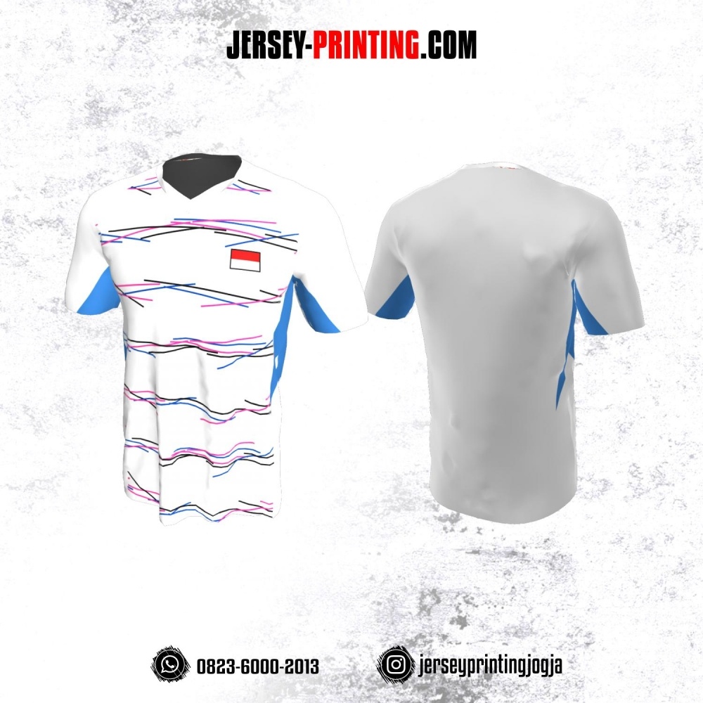 Jersey Badminton Putih Motif Line Abstrak Biru Pink Hitam