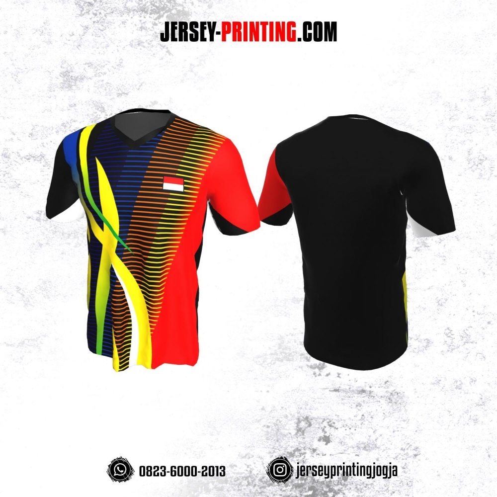 Jersey Badminton Hitam Merah Motif Strip Kuning Biru Orange
