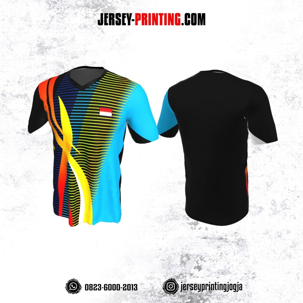 Jersey Badminton Hitam Biru Motif Strip Kuning Orange