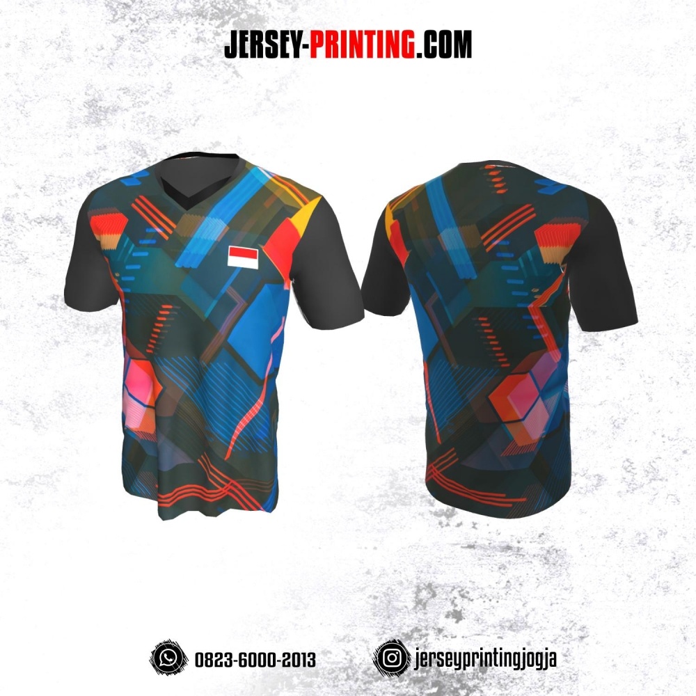 Jersey Badminton Biru Hitam Merah Motif Abstrak