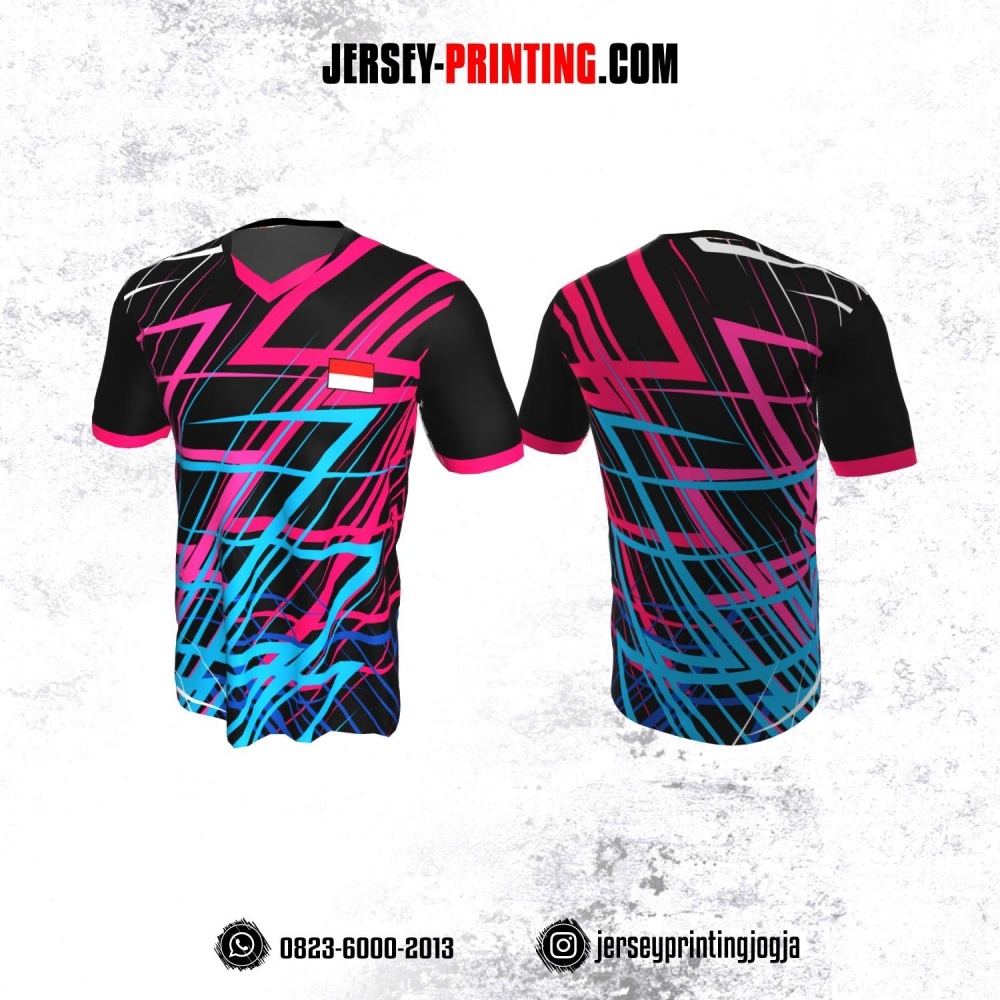 Jersey Badminton Hitam Motif Garis Abstrak Pink Biru