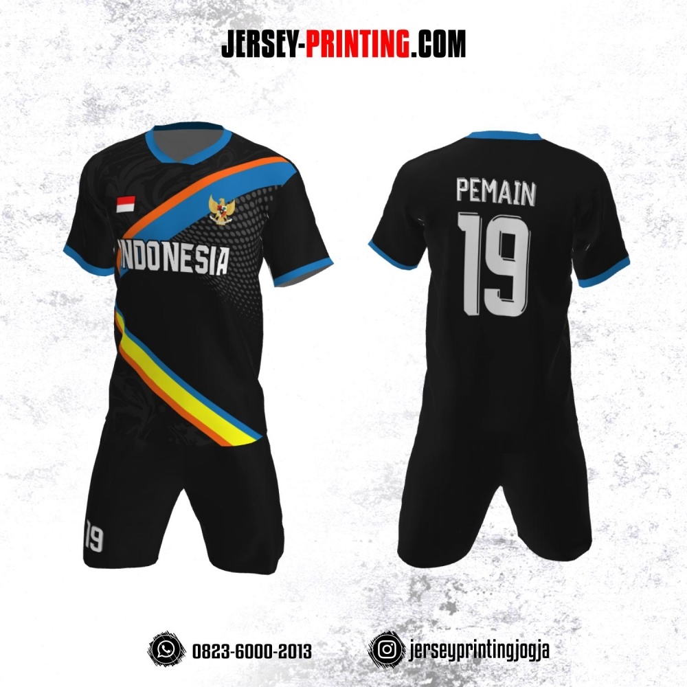Jersey Futsal Hitam Motif Garis Biru Orange Kuning dan Polkadot Abu-abu
