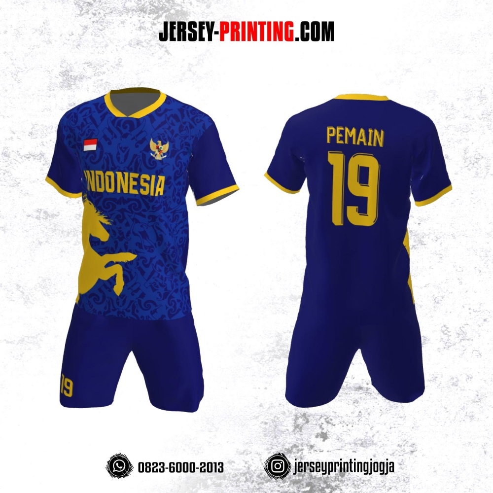 Jersey Futsal Biru Navy Kuning Motif Batik dan Pola Kuda