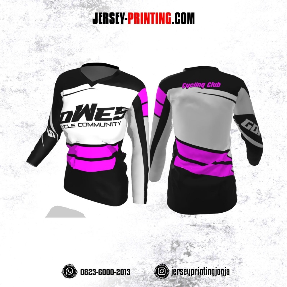 Jersey Cewek Gowes Sepeda Hitam Corak Putih Ungu Lengan Panjang