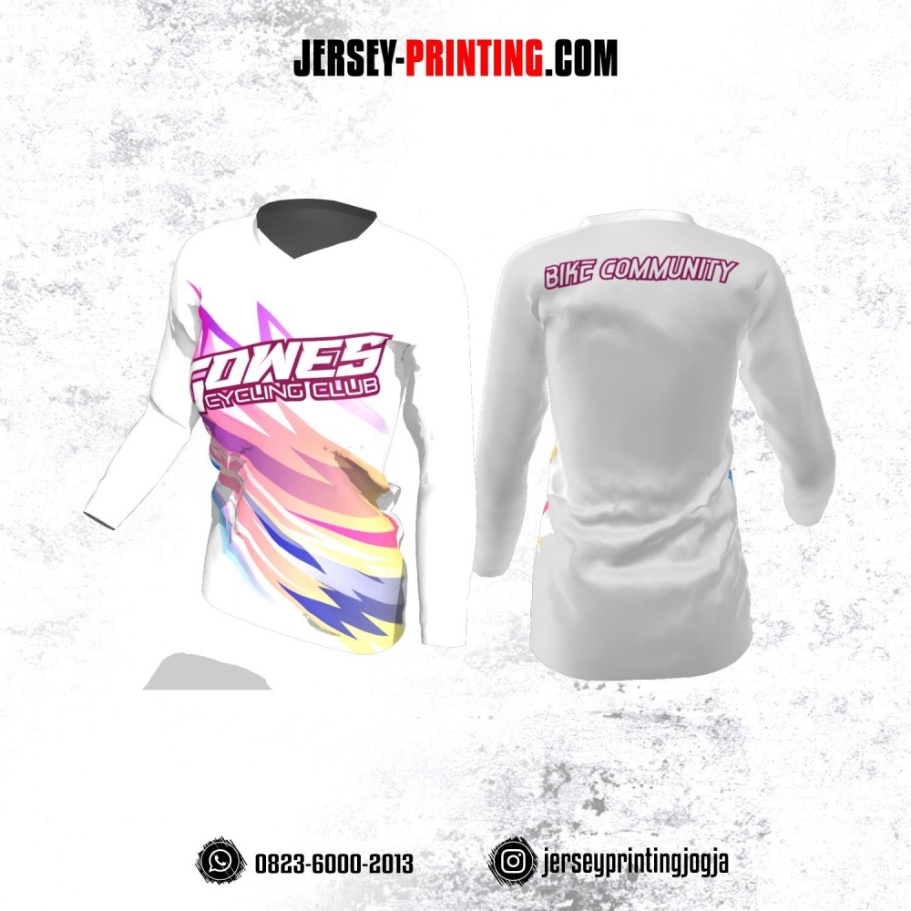 Jersey Cewek Gowes Sepeda Putih Motif Kilat Ungu Kuning Lengan Panjang
