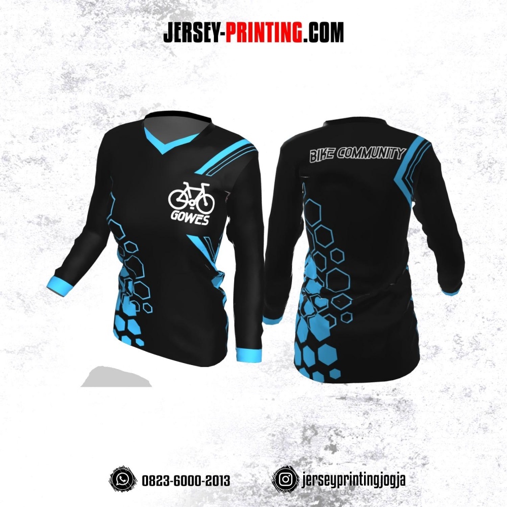 Jersey Cewek Gowes Sepeda Hitam Motif Hexagon Biru Lengan Panjang