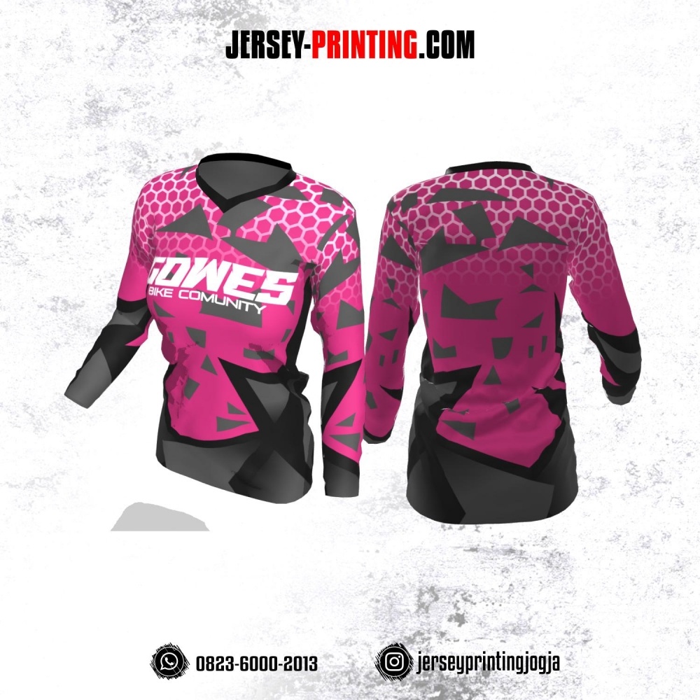 Jersey Cewek Gowes Sepeda Pink Abu-abu Motif Honeycomb Putih Lengan Panjang