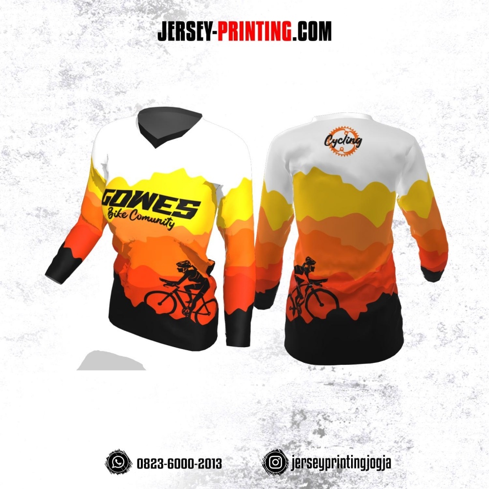 Jersey Cewek Gowes Sepeda Orange Kombinasi Kuning Corak Putih Hitam Lengan Panjang
