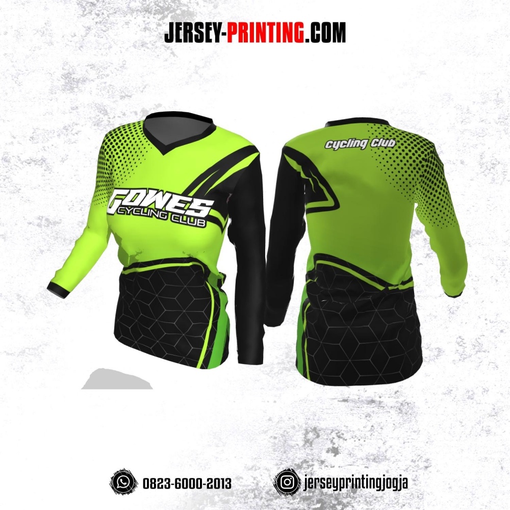 Jersey Cewek Gowes Sepeda Hijau Hitam Motif Geometris dan Polkadot Lengan Panjang