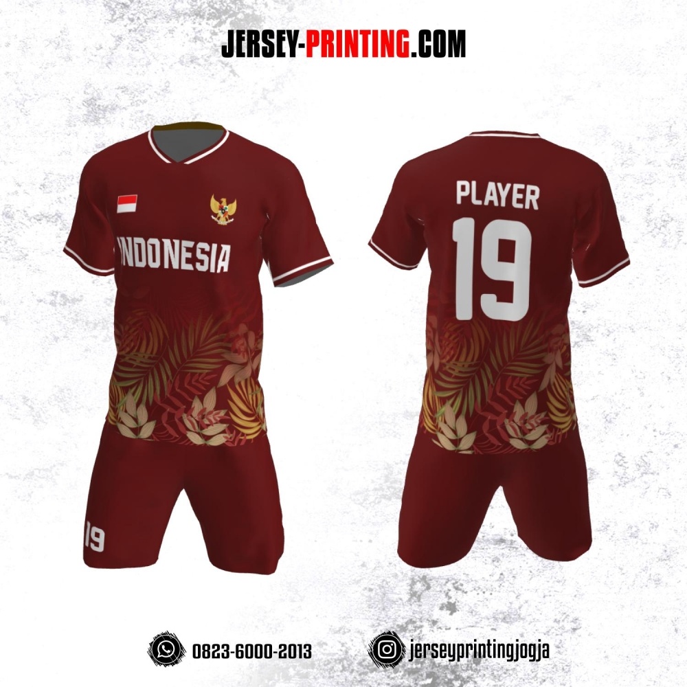 Jersey Futsal Merah Motif Flora Hijau Kuning