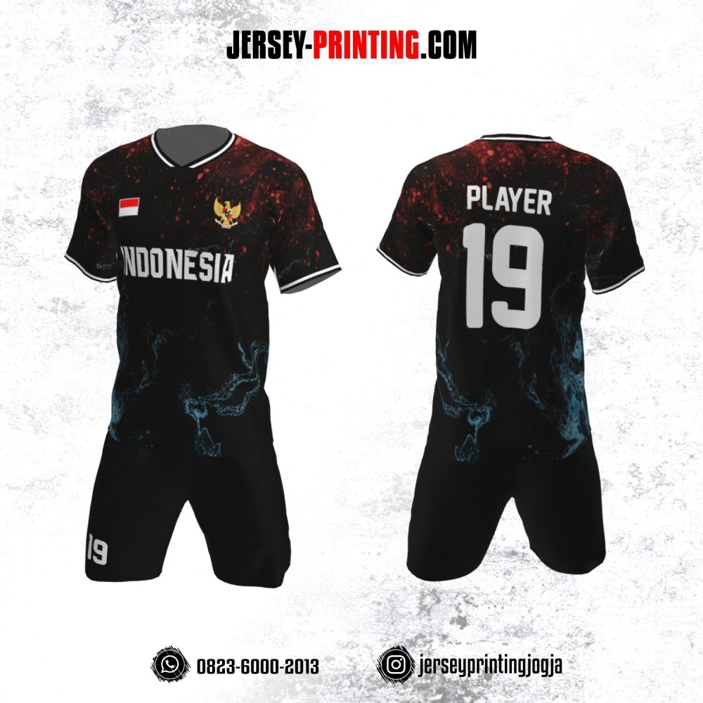 Jersey Futsal Hitam Percikan Api Merah Biru