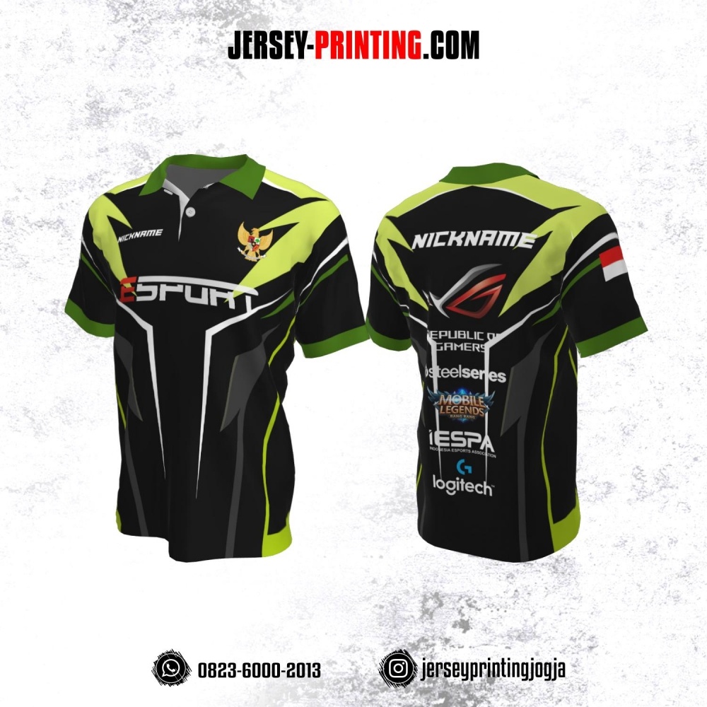 Jersey Gaming Esports Kerah Polo Hitam Corak Hijau Putih