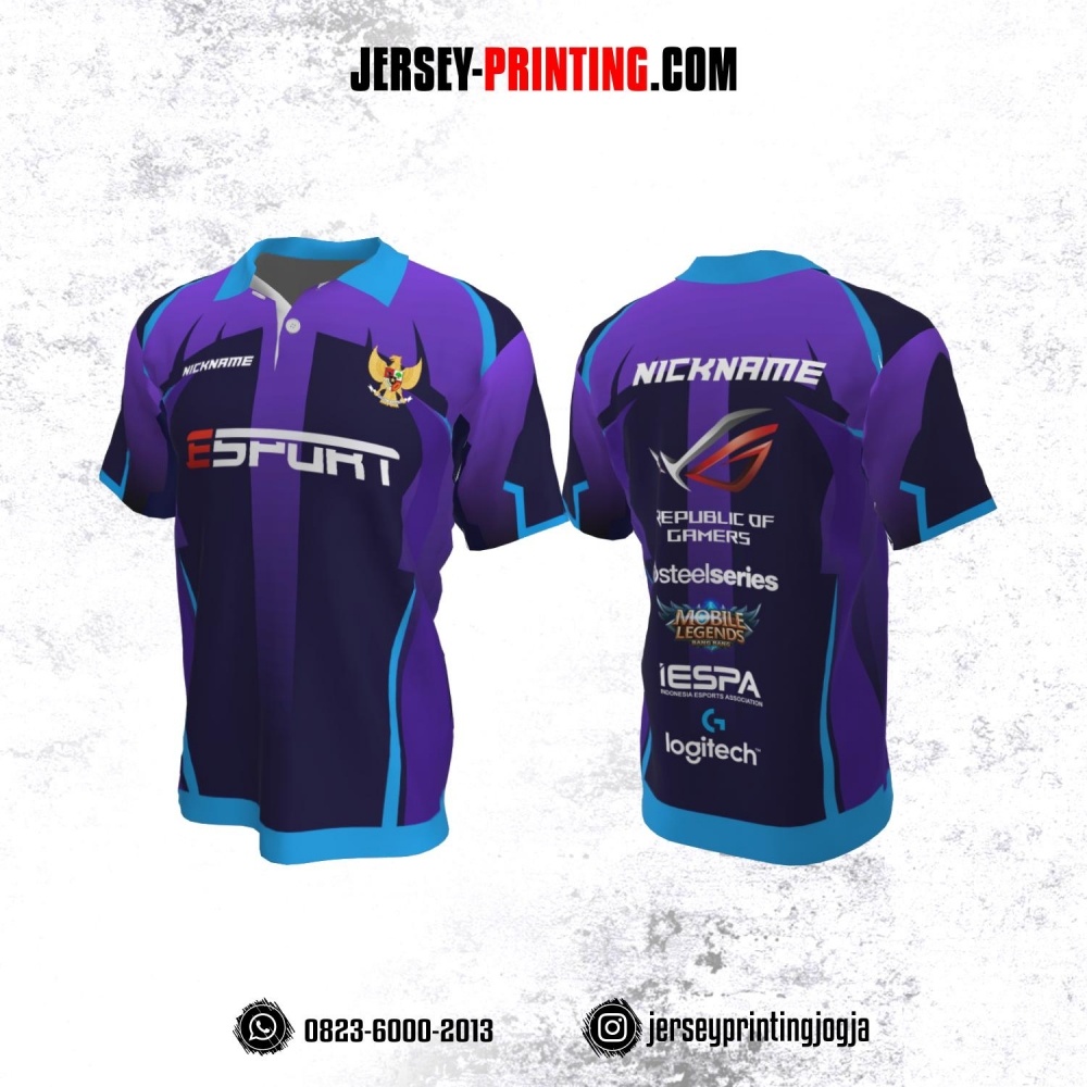 Jersey Gaming Esports Kerah Polo Ungu Kombinasi Corak Biru