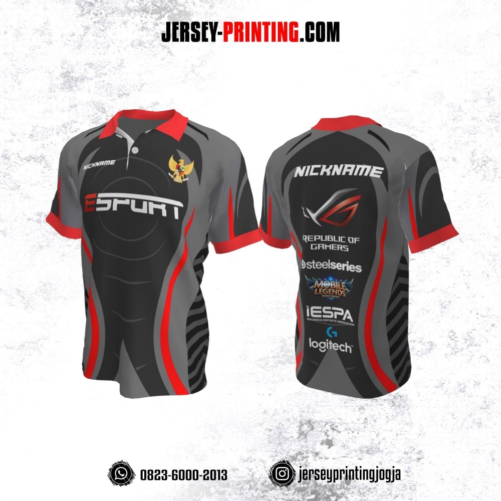 Jersey Gaming Esports Kerah Polo Abu-abu Hitam Merah Motif Garis