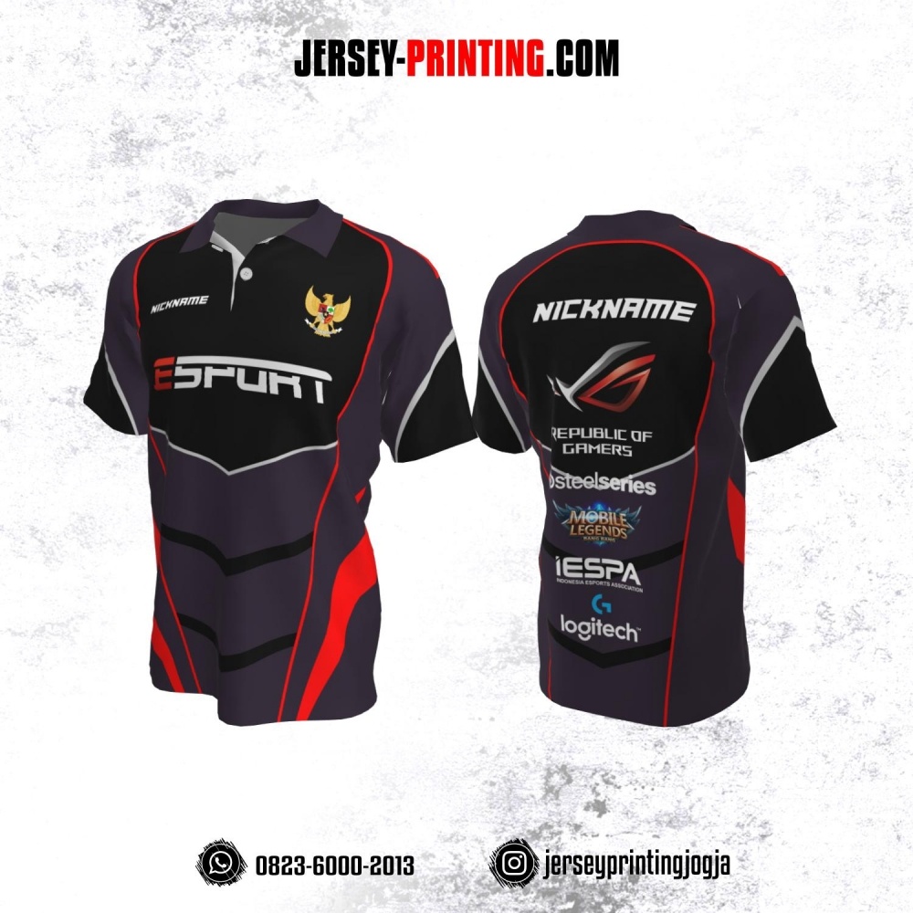 Jersey Gaming Esports Kerah Polo Burgundy Hitam Garis Merah