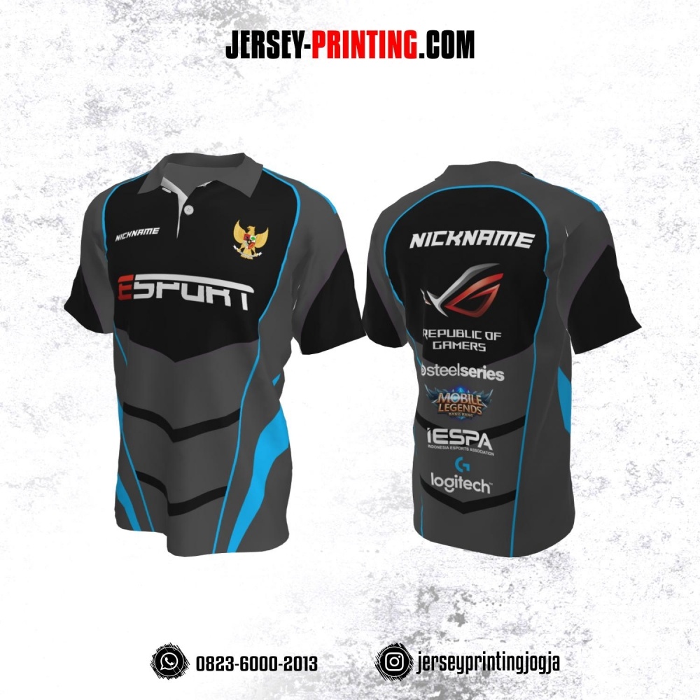 Jersey Gaming Esports Kerah Polo Abu-abu Hitam Garis Biru