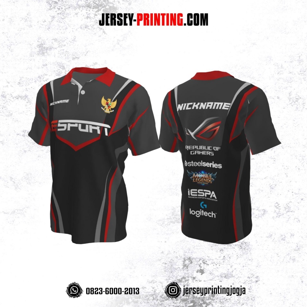 Jersey Gaming Esports Kerah Polo Abu-abu Corak Hitam Merah