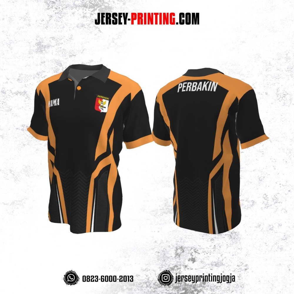 Baju Kaos Jersey Menembak Perbakin Kerah Polo Hitam Orange Motif Zigzag Abu-abu