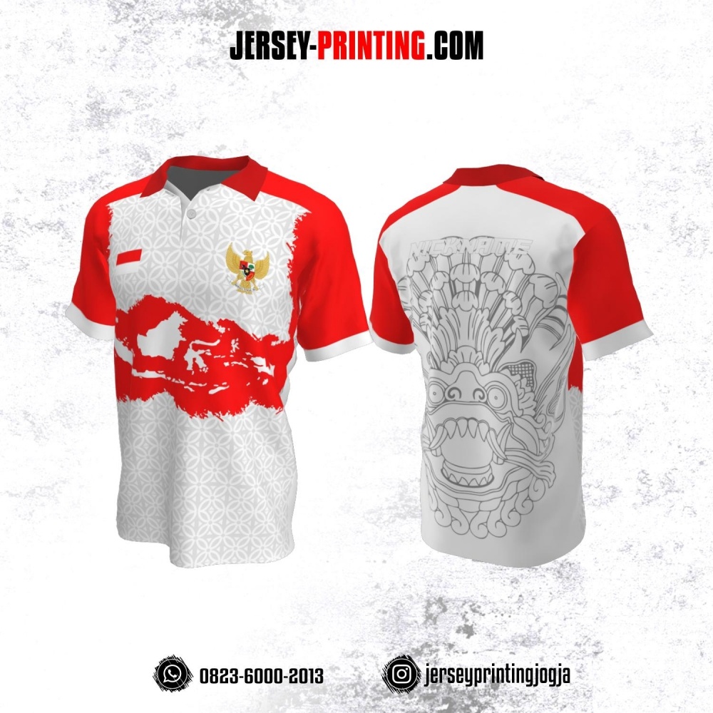 Jersey Gaming Esports Kerah Polo Putih Merah Abu-abu Motif Batik