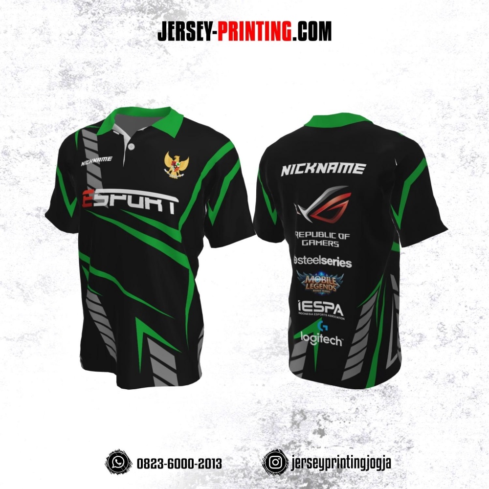 Jersey Gaming Esports Kerah Polo Hitam Motif Abstrak Hijau Abu-abu
