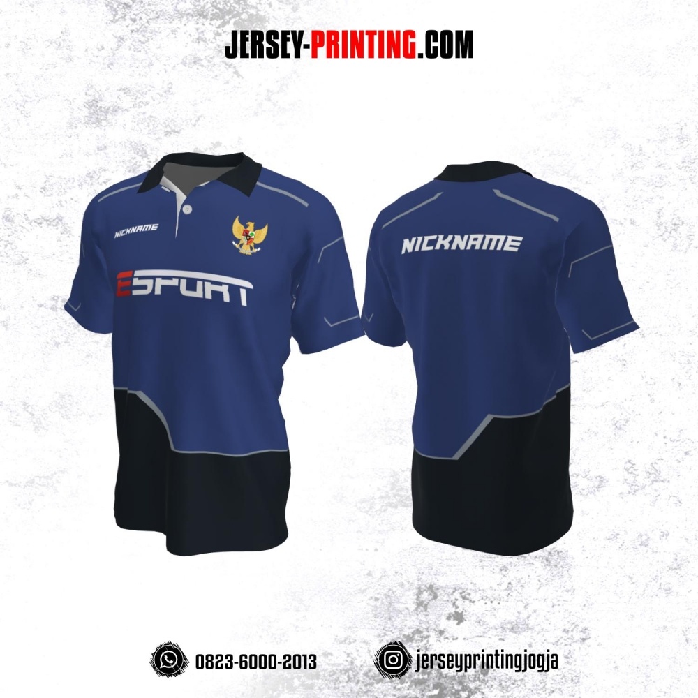 Jersey Gaming Esports Kerah Polo Biru Hitam Garis Abu-abu