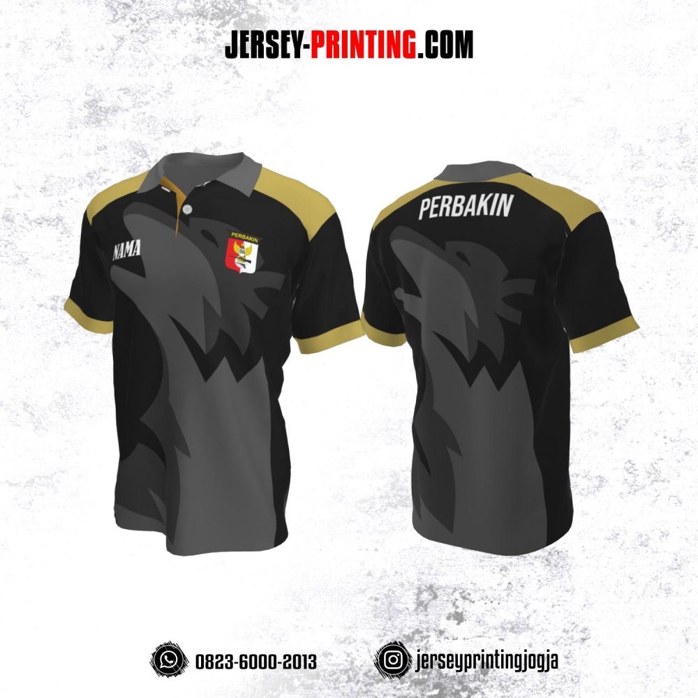 Baju Kaos Jersey Menembak Perbakin Kerah Polo Hitam Corak Abu-abu Kuning