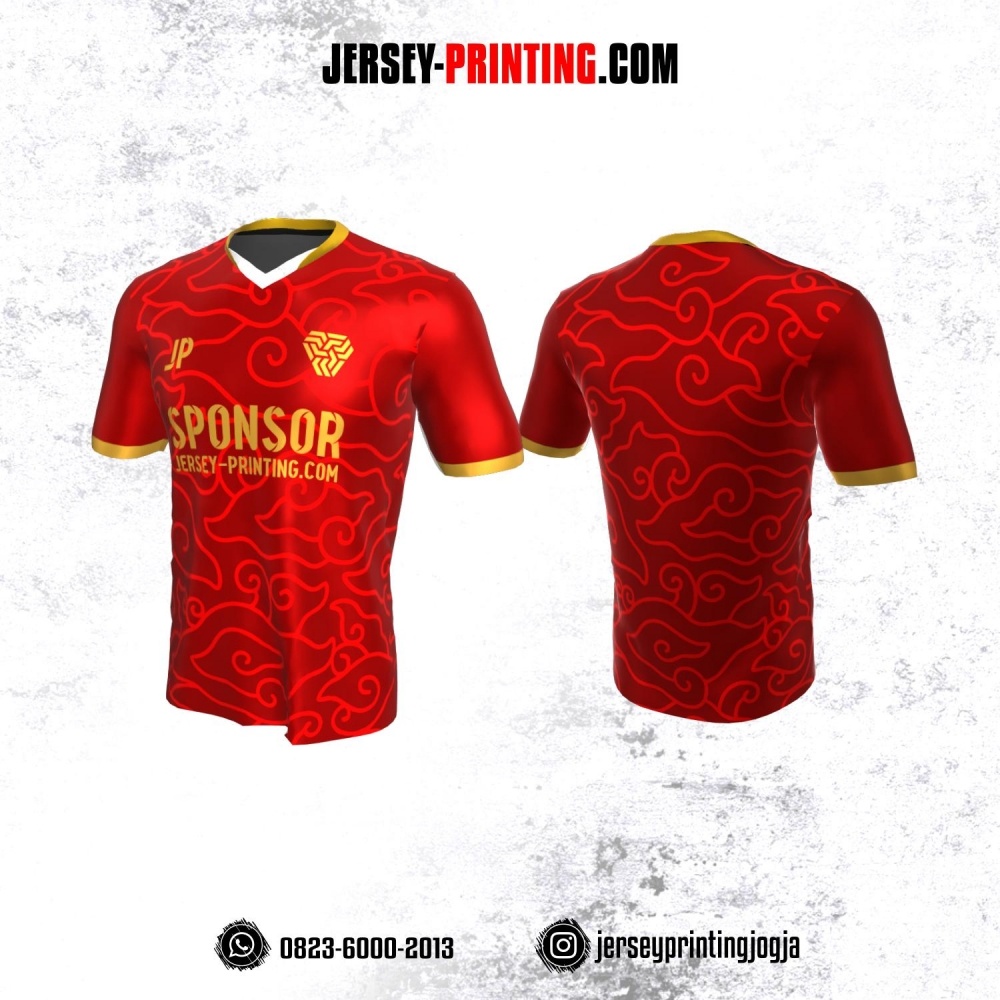Jersey Atasan Badminton Volly Lari Futsal Merah Kuning Motif Batik Megamendung