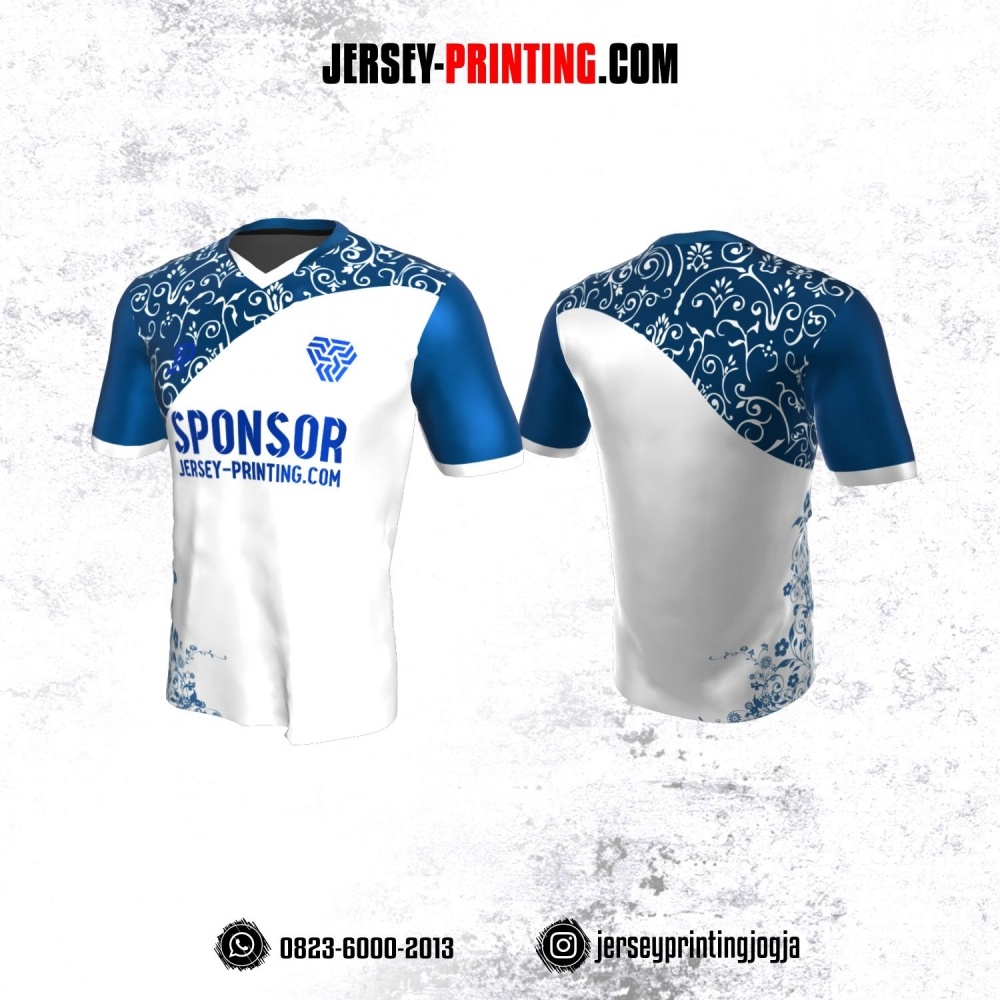 Jersey Atasan Badminton Volly Lari Futsal Putih Biru Motif Batik Floral