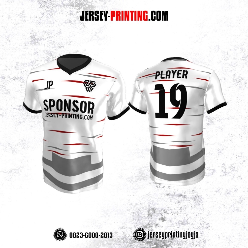 Jersey Atasan Badminton Volly Lari Futsal Putih Motif Strip Abu-abu Merah