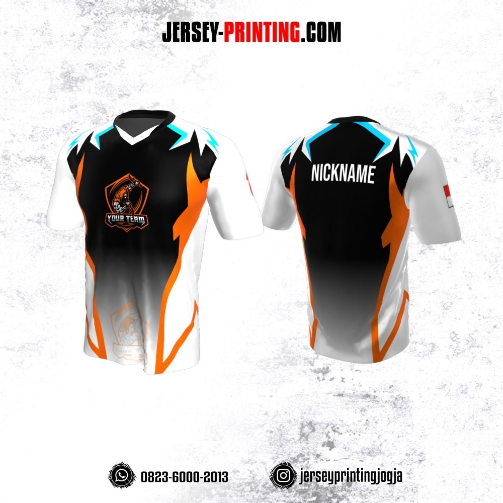 Jersey Gaming Esports Putih Hitam Corak Orange Biru
