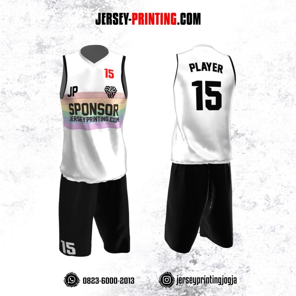 Jersey Basket Putih Hitam Motif Garis Merah Kuning Pink