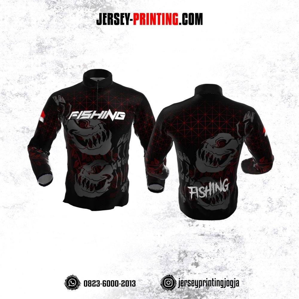 Jersey Mancing Fishing Angler Resleting Lengan Panjang Hitam Abu-abu Merah Motif Geometris