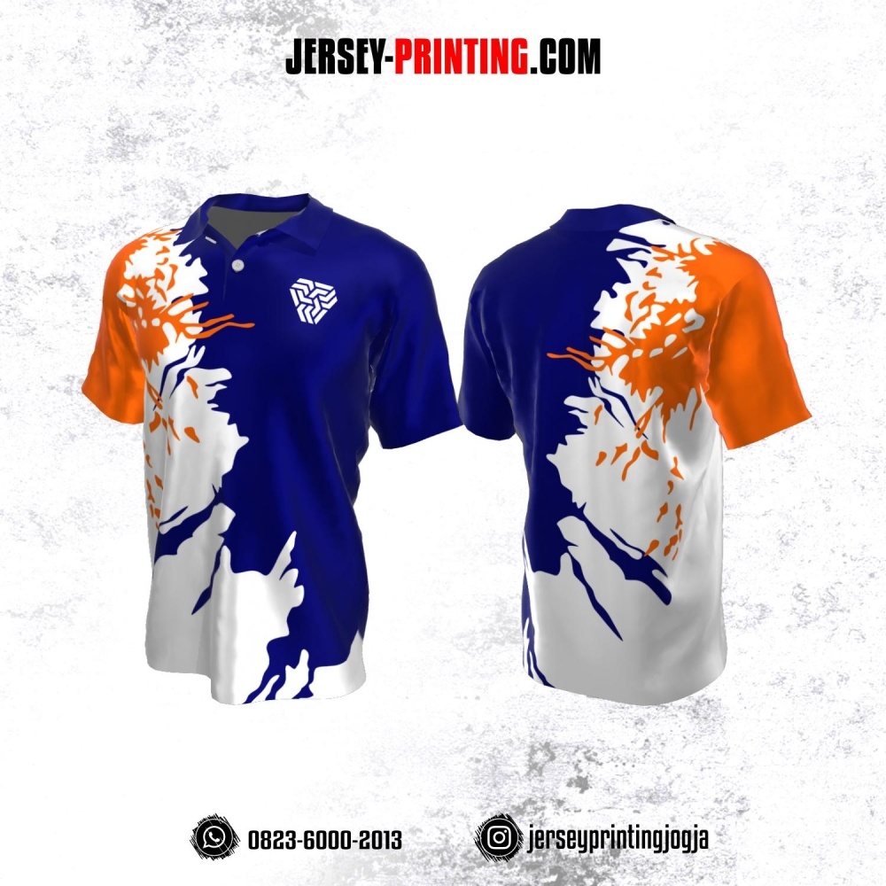Jersey Atasan Badminton Volly Lari Futsal Kerah Polo Putih Navy Orange Motif Abstrak