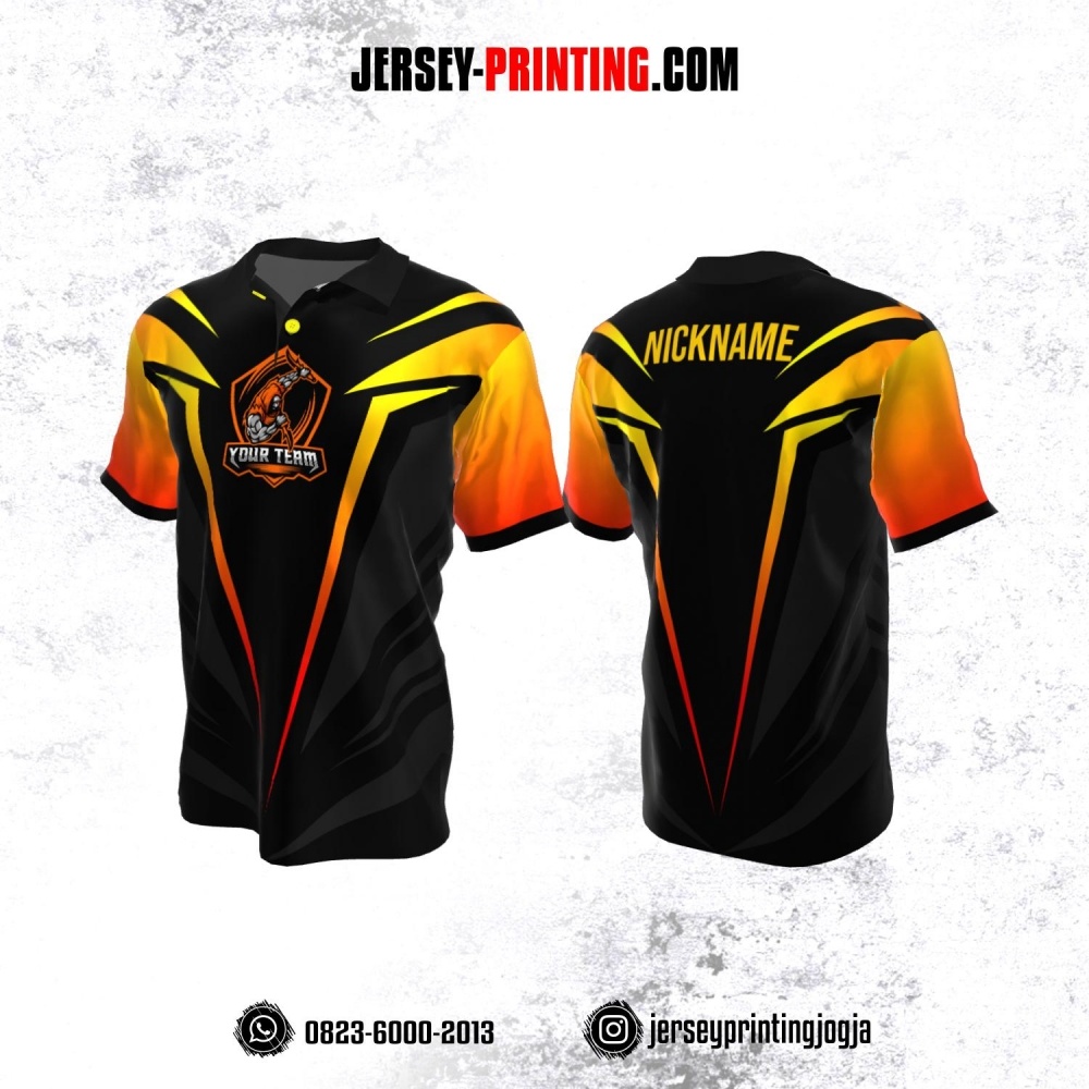 Jersey Atasan Badminton Volly Lari Futsal Kerah Polo Hitam Abu-abu Corak Orange Kuning