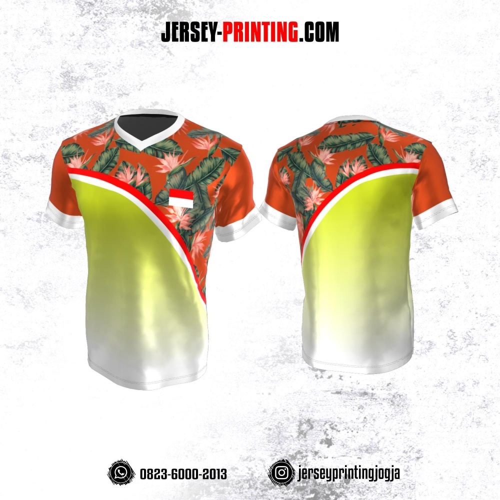 Jersey Atasan Badminton Volly Lari Futsal Hijau Orange Putih Motif Tropical