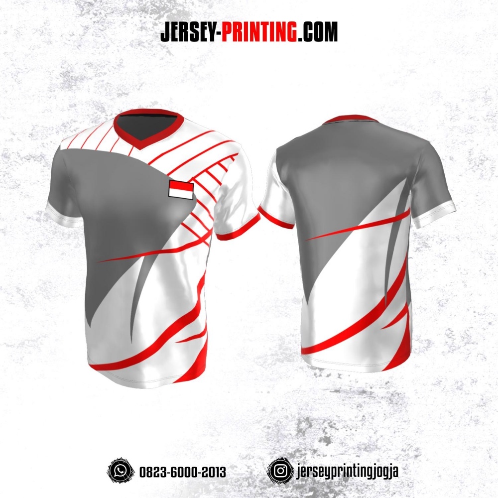 Jersey Atasan Badminton Volly Lari Futsal Putih Abu-abu Motif Garis Merah