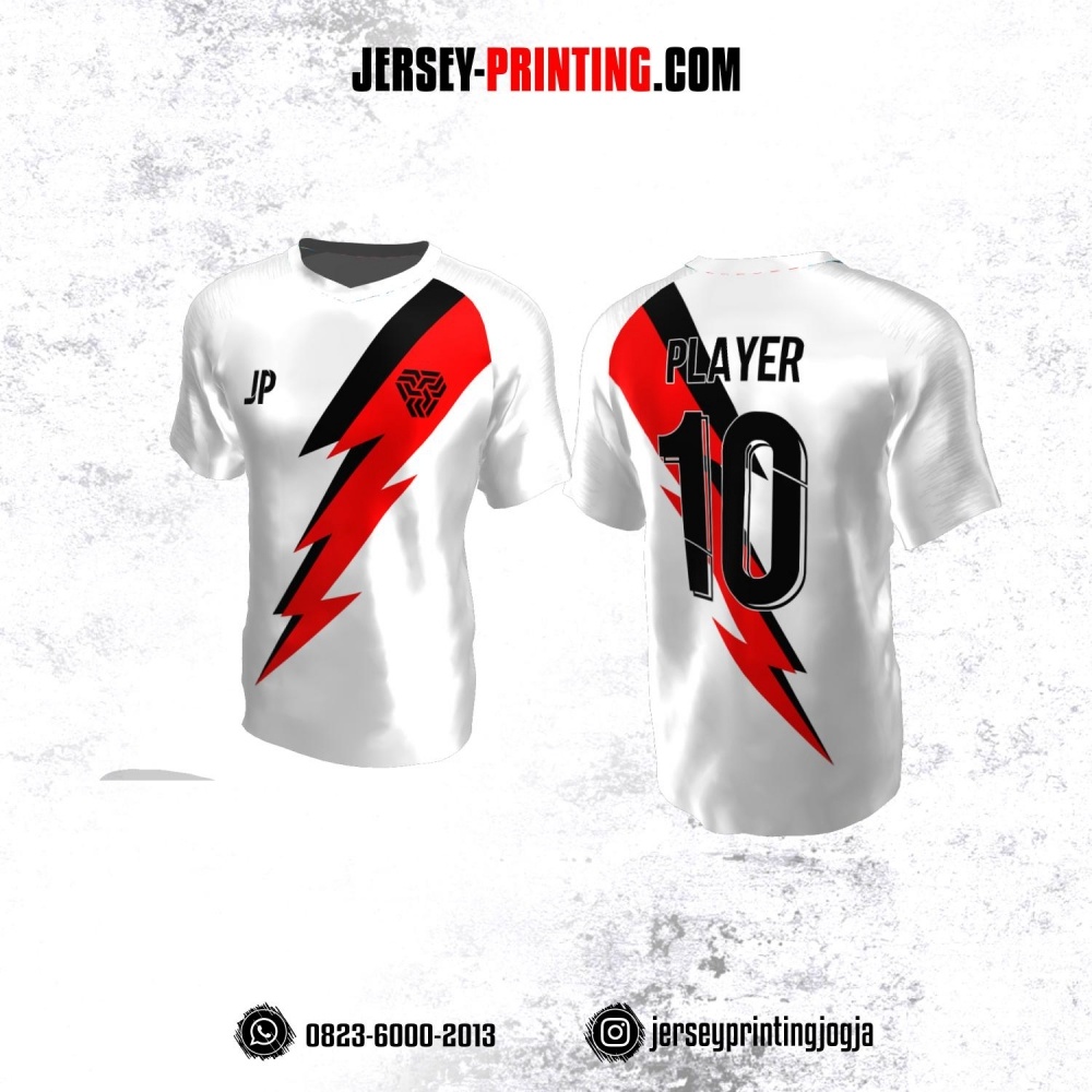 Jersey Atasan Badminton Volly Lari Futsal Putih Motif Petir Merah Hitam
