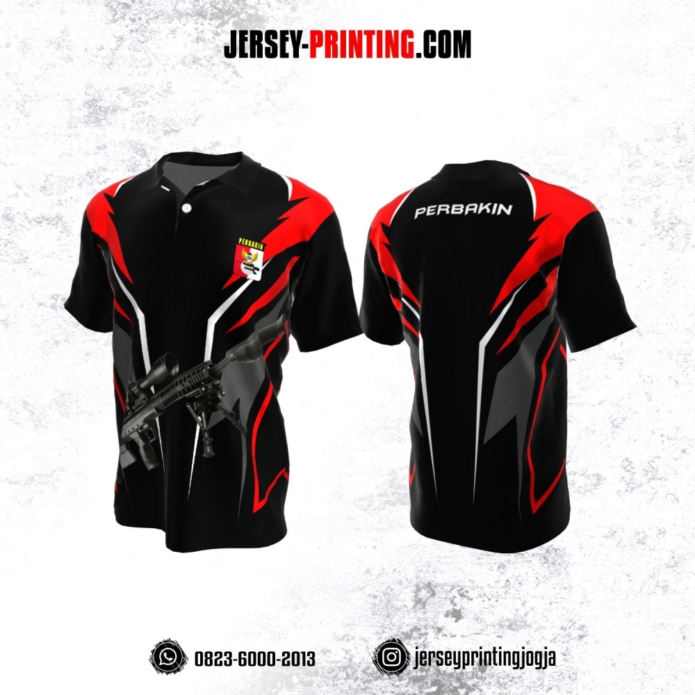 Baju Kaos Jersey Menembak Perbakin Kerah Polo Hitam Corak Merah Abu Putih