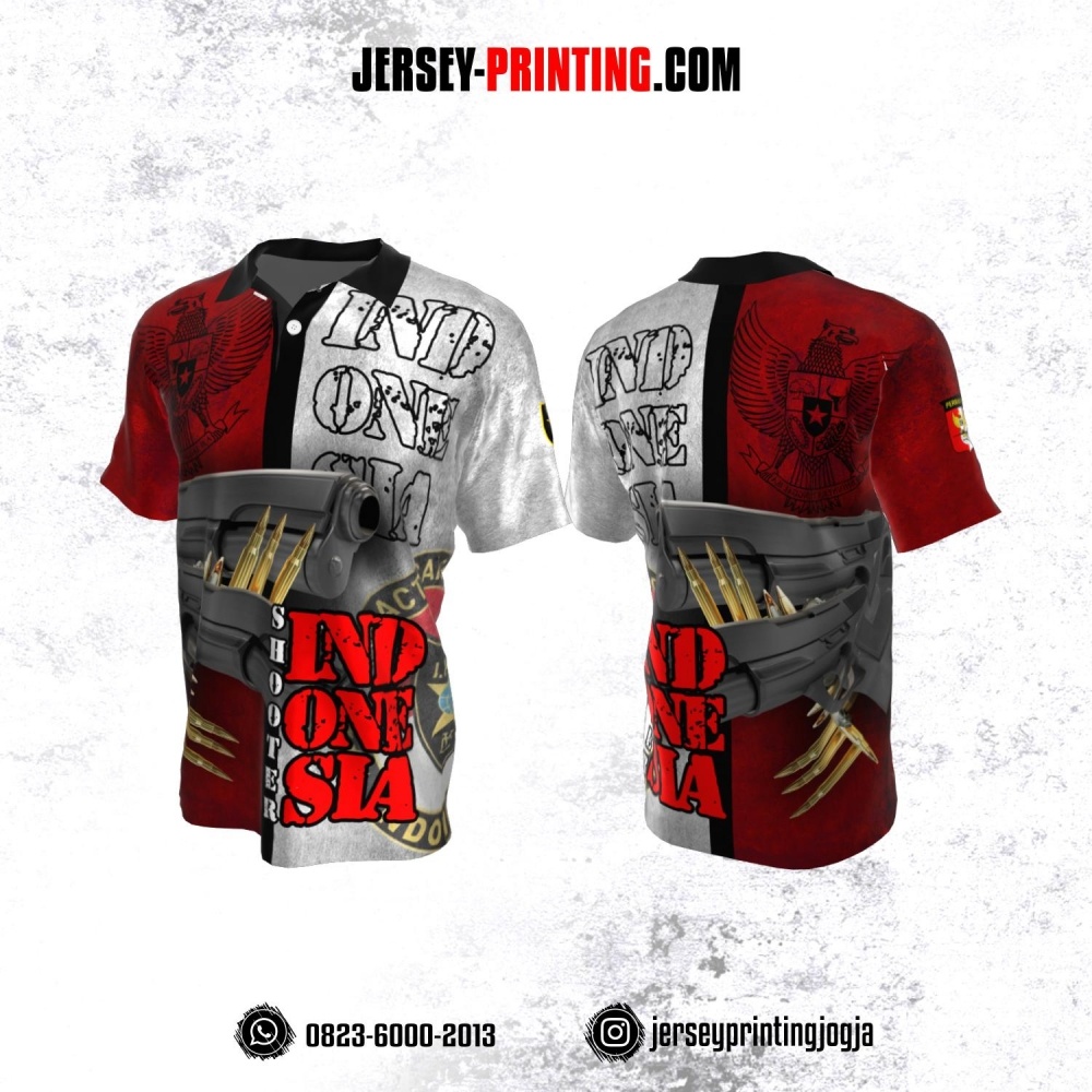 Baju Kaos Jersey Menembak Perbakin Kerah Polo Merah Abu-abu Hitam Motif Bercak